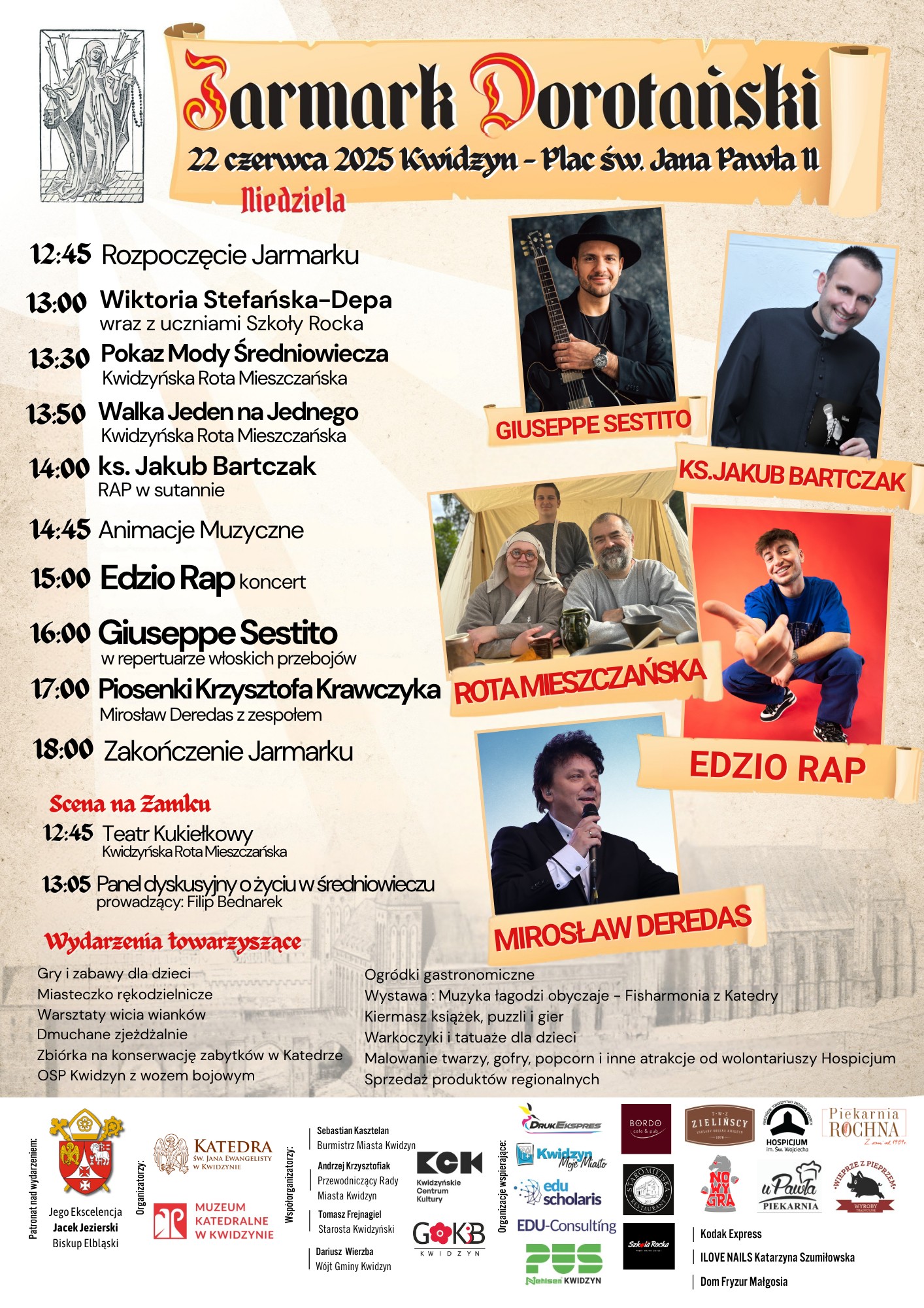 Za tydzień w niedzielę 22 czerwca zapraszamy na Mszę Świętą odpustową bł. Doroty o g. 11.00 po Eucharystii rozpocznie się jarmark Dorotański. Liczne występy muzyczne, rekonstrukcję historyczne, pokaz dawnych rzemiosł, gry i zabawy dla dzieci. Warsztaty wicia wianków i tatuaże zmywalne. Koła gospodyń zapraszają na przepyszne jedzenie.