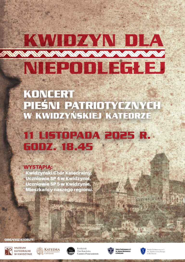Serdecznie zapraszamy na Koncert Patriotyczny „Kwidzyn dla Niepodległej”, który odbędzie się we wtorek 11 listopada 2025 r. o godz. 18.45 w Kwidzyńskiej Katedrze.Wystąpią: Chór Katedralny